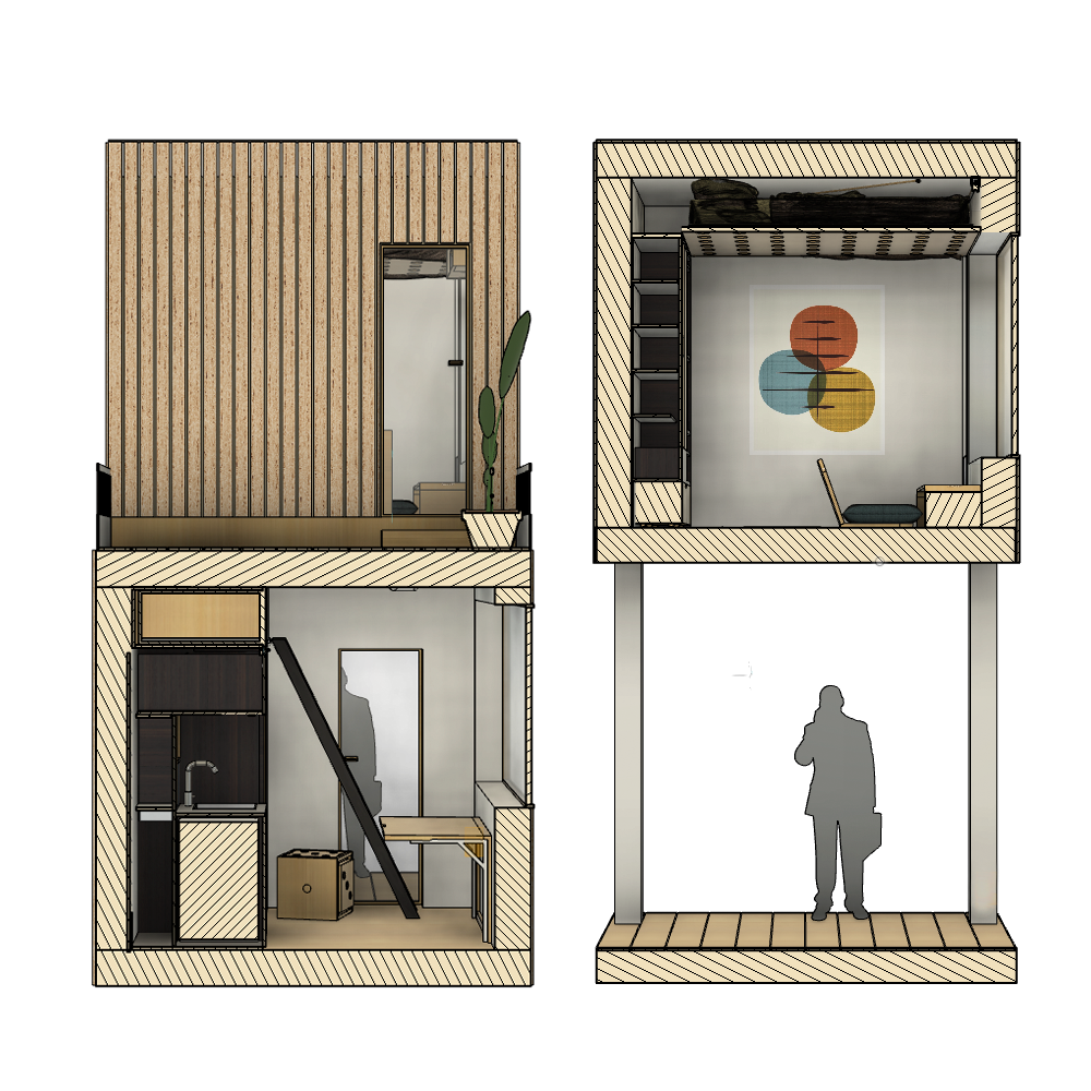 “Little Homes” was a cooperation project with the "Stadt Potsdam". As an integration measure, the “Housing, Work and Integration” department intends to set up a production of modular, low-cost, transportable and ecological micro-houses and to create low-cost space for small businesses and residential purposes. The very well thermally insulated, rectangular, rowable and stackable modules are based horizontally and vertically on a 3-meter grid and are to be made largely from wood-based materials. The aim of the course was to develop concepts for different needs and uses in the areas of living and working and to demonstrate the feasibility and attractiveness of the project.